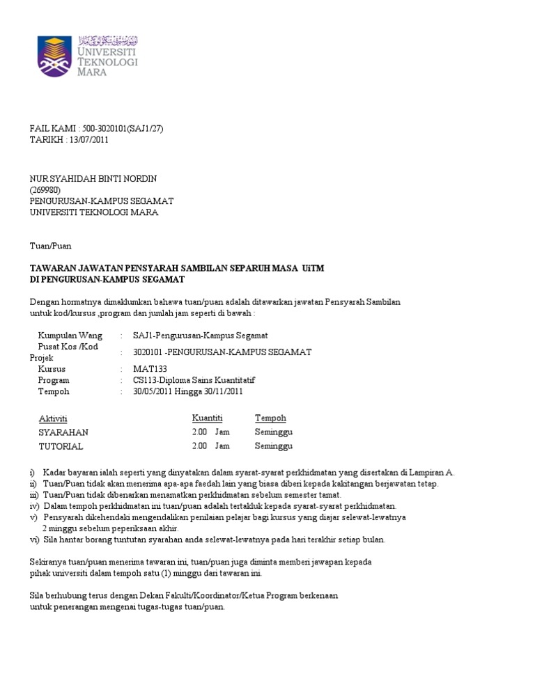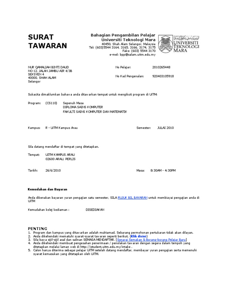 Cik Natrah Nabilah bt Adanan. Surat tawaran ini hanya untuk kegunaan pendaftaran pelajar sahaja. Jobshop UiTM an online career portal is now back with better features.